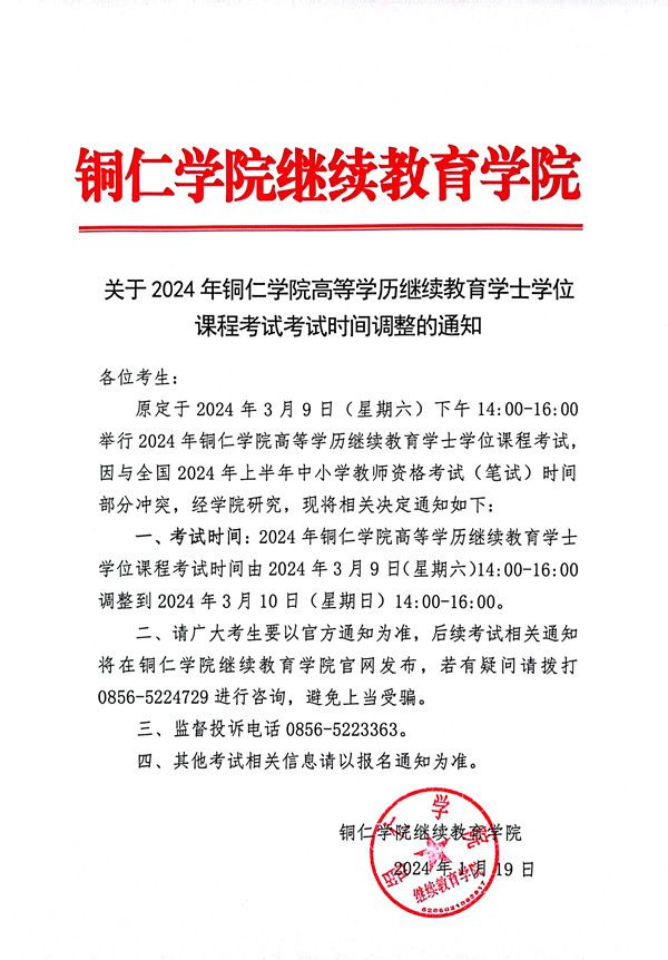 关于2024年beat365中国唯一官网高等学历继续教育学士学位课程考试考试时间调整的通知
