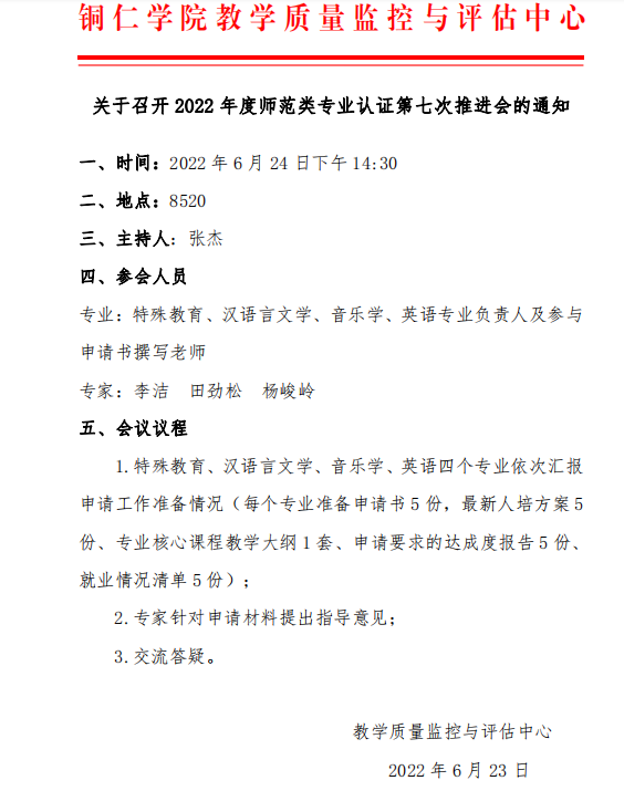 关于召开2022年度师范类专业认证第六次推进会的通知