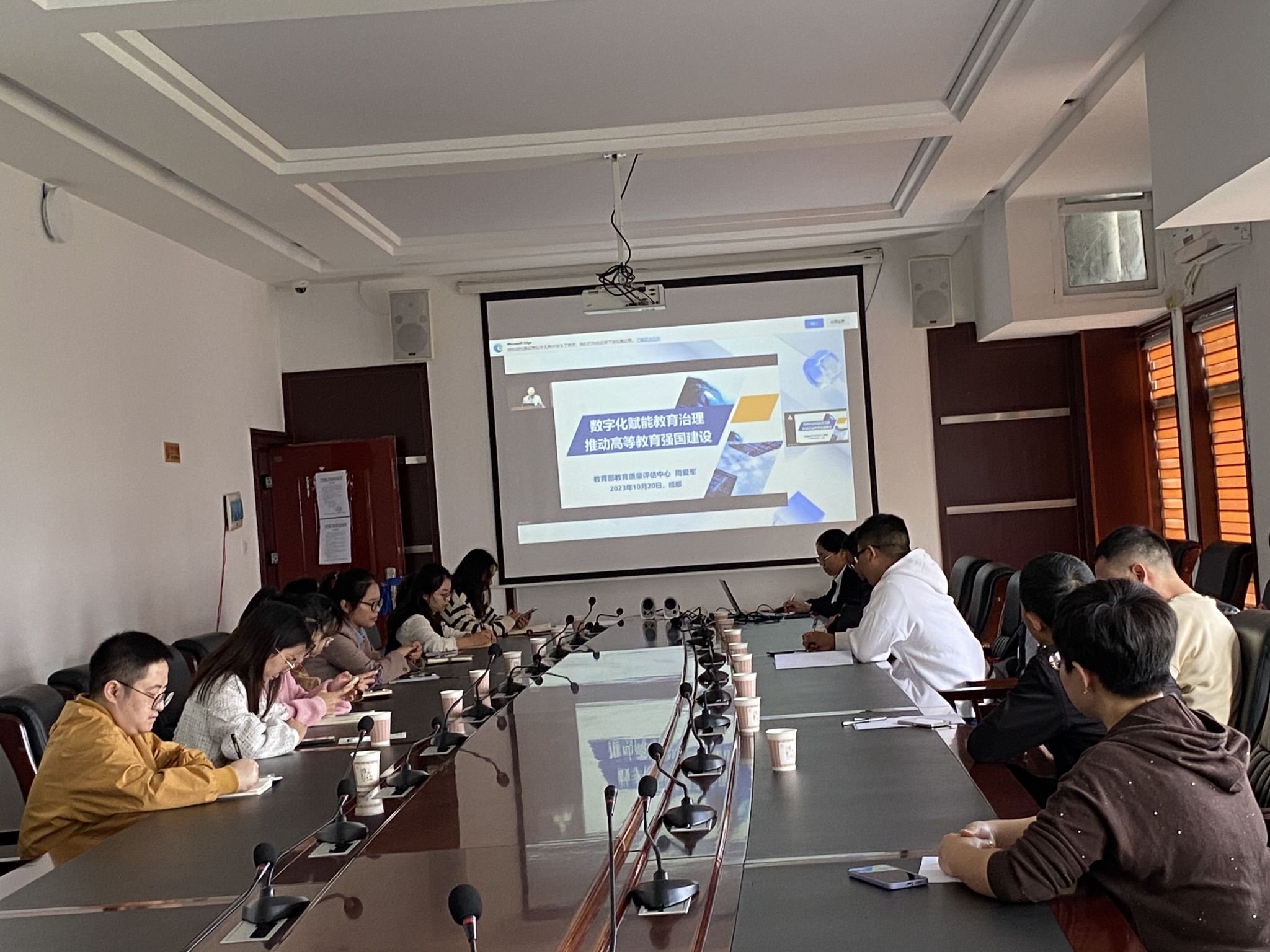 接着,大家集体观看了教育部教育质量评估中心周爱军以“数字化赋能教育治理推动高等教育强国建设”为主题的线上培训视频及教育部评估中心信息处处长吴四九对教学状态数据采集的意义和内涵进行的解读等。培训时,周爱军教授强调,教育强国建设使命在肩、教育数字化大势所趋、准确识变积极应变主动求变、并能拥抱新时代作出新贡献。线上培训后,参会人员对一些问题与刘定巧老师进行交流讨论。