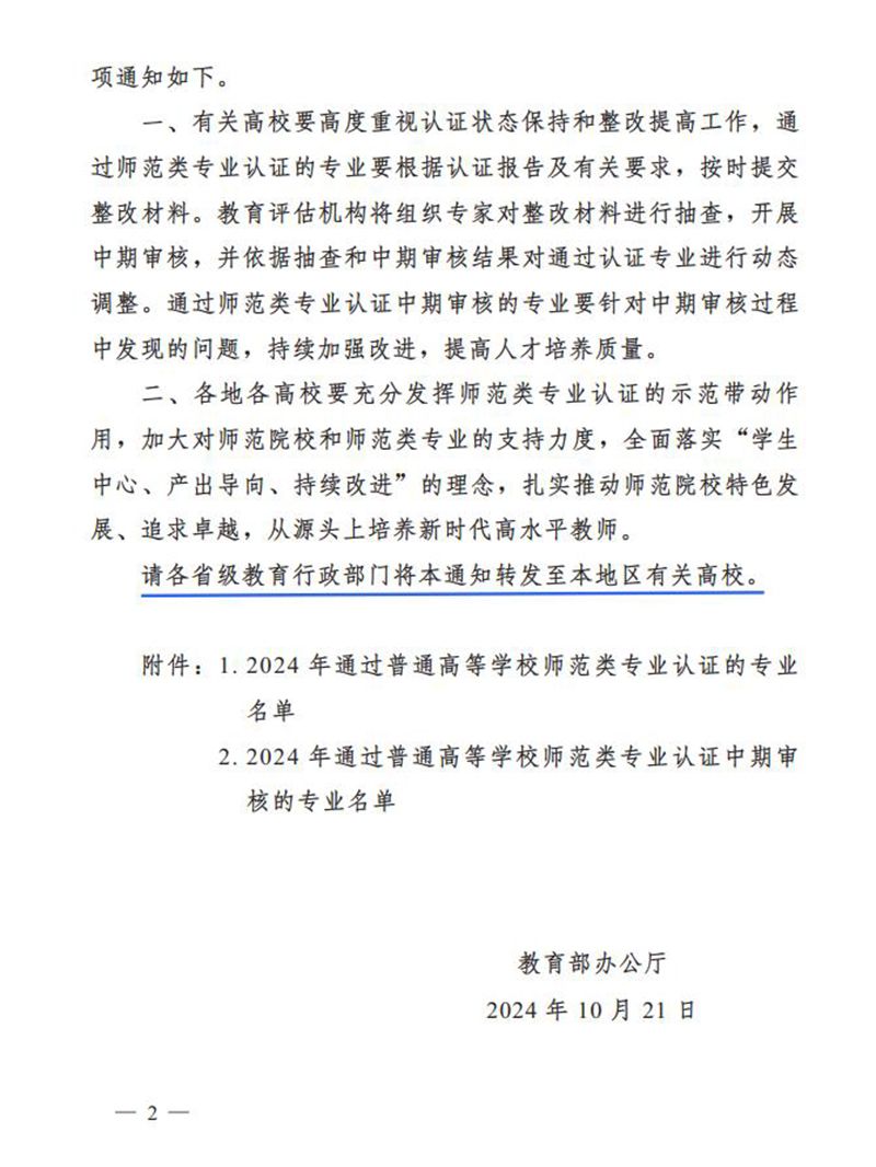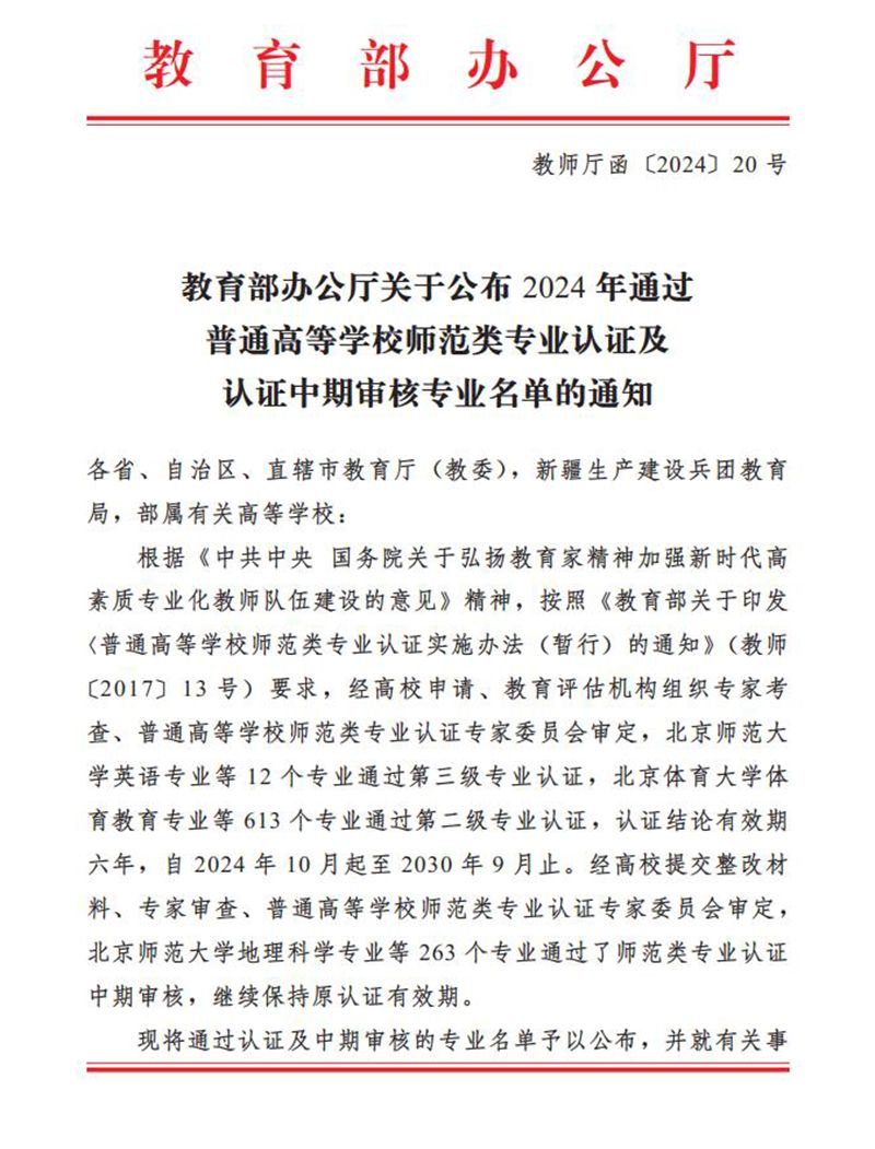 近日,教育部办公厅发文公布2024年通过普通高等学校师范类专业认证专业名单,beat365官网的小学教育、英语、数学与应用数学、汉语言文学、音乐学、特殊教育6个专业顺利通过师范类专业第二级认证,认证结论有效期六年,自2024年10月起至2030年9月止。同时,学前教育专业顺利通过了师范类专业二级认证中期审核工作,继续保持认证有效期。