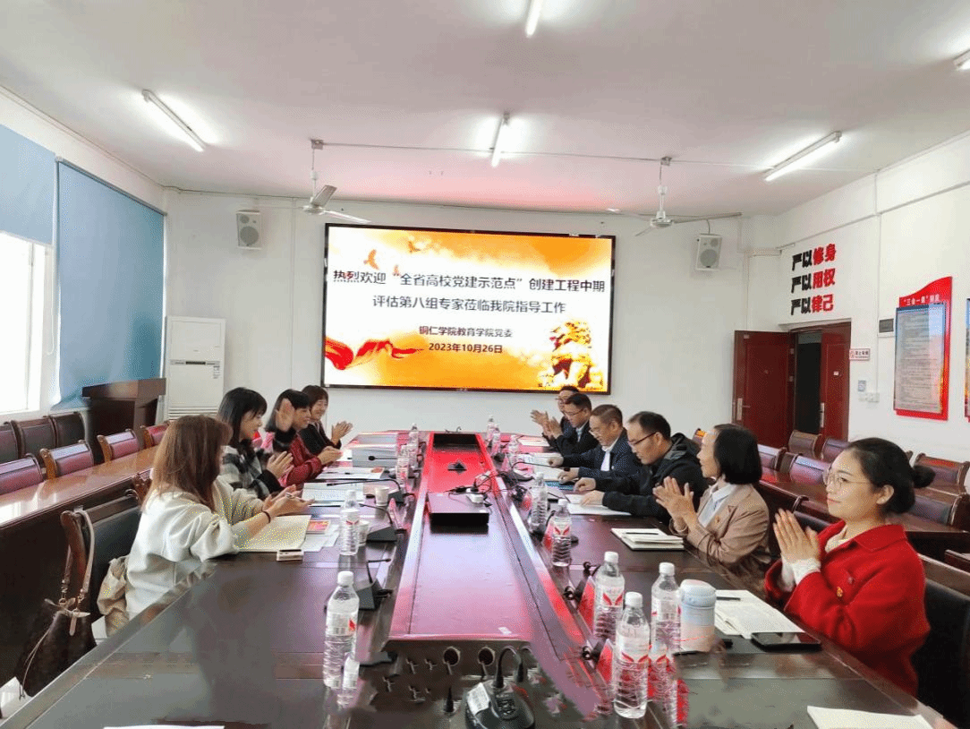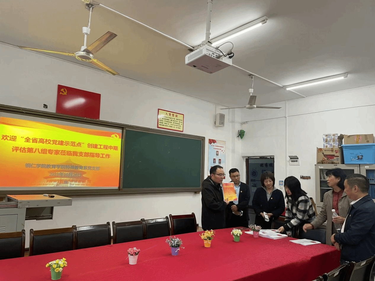 2023年10月26日,省委教育工委第八检查组到教育学院实地检查特殊教育系党支部“全省党建工作样板党支部”创建工程中期建设工作。省委教育工委第八检查组组长由贵州理工学院党委组织部副部长、机关党委书记王琳同志担任,检查组成员有贵州理工学院党委组织部何盈盈同志、何丹妮同志。beat365中国唯一官网党委组织部副部长周慧娟同志,教育学院党委副书记吴承品同志,教育学院党委委员、党政办主任敖俊同志,特殊教育系党支部书记刘方林同志,基础教育系党支部书记杨秀琴同志,学生党支部组织委员谢焕庭同志,特殊教育系党支部全体党员同志及学生代表参加会议。会议由教育学院党委书记崔德虎同志主持。 座谈会上,首先播放了中共贵州省委宣传部“文艺精品”创作扶持重点项目成果《黔东红色组歌》视频;接着,崔德虎书记对专家组的莅临检查指导支部创建工作表示热烈欢迎,并简要介绍了教育学院党建工作开展情况。刘方林同志汇报了特殊教育系党支部省级样板党支部中期建设进展情况,他重点介绍了“党建引领下特殊教育专业医教结合‘1+3’服务育人”模式以及党支部“1451”党建工作机制。
