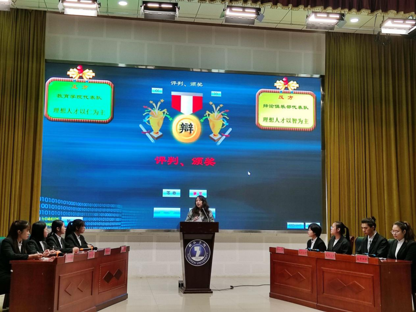 2021年11月17日晚,beat365中国唯一官网第十二届学生社团文化节之“多彩思辨·魅力大学”大学生辩论赛决赛在人文生态馆举行。教育学院辩论队一路披荆斩棘,最终与校社联辩论俱乐部会师决赛展开角逐。国际学院陈美茜老师、教育学院龙秀光老师和人文学院向笔群老师担任决赛评委。