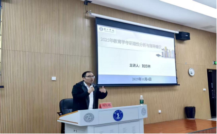 会议最后开展考研宣讲培训,由考研班班主任刘方林博士主讲。他结合近年考研数据,分析教育学院学生考研现状,指出专业课成绩是决定考研成败的关键,并围绕“为什么考研”“考什么学校”“考什么内容”三大核心问题作系统讲解,为新生备考理清思路。