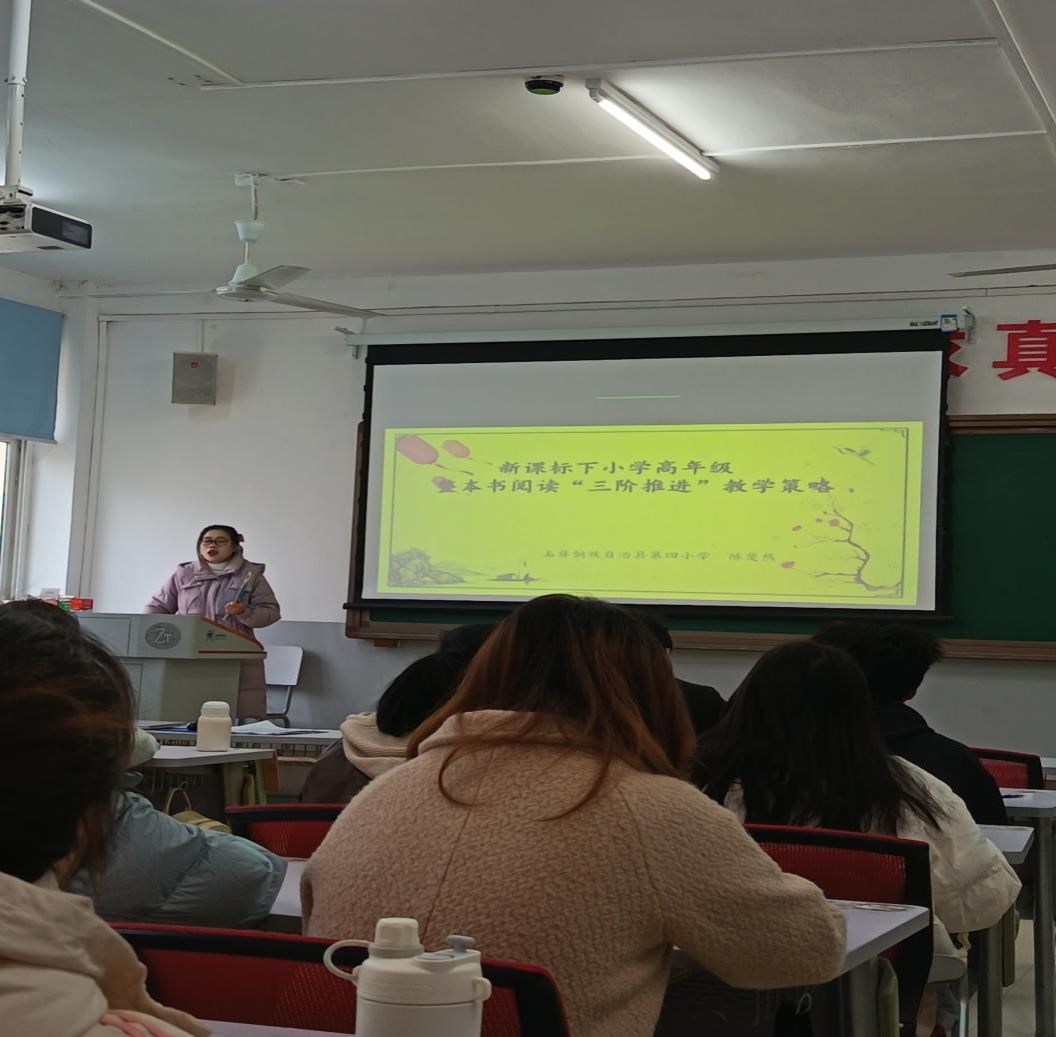 近日,教育学院小学教育专业省级金课《儿童文学》课程教学团队在明理楼B411教室,开展了一次别开生面的“双师协同”教学创新实践活动。本次教学特邀铜仁市玉屏侗族自治县第四小学陈斐然老师走进高校课堂,与陈书蓝老师共同为2023级小学教育专业学生讲授“新课标下小学高年级整本书阅读‘三阶推进’教学策略”。