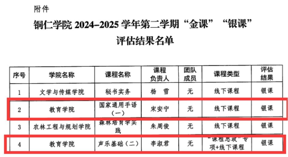 近日,beat365中国唯一官网2024-2025学年第二学期“金课”“银课”评估结果正式公布,教育学院再创佳绩,共有两门课程荣获“银课”称号,分别是《国家通用手语(一)》和《声乐基础(二)》。此次全校共评选出4门“银课”,教育学院占比50%,展现出学院在课程建设与教学质量提升方面的显著成效。