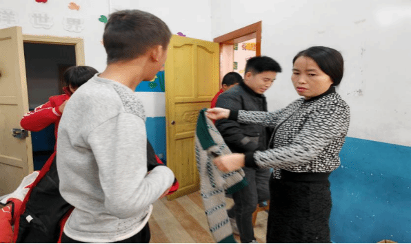 石阡县特校老师给学生分发衣物