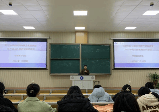 为了加强学生对师范生职业能力考核要求的了解,解答学生对即将到来的教师资格证面试的问题与困惑,提升其面试技巧,我院学前教育专业于2023年11月30日下午在博思楼102开展了师范生职业能力考核方案解读暨2023年幼儿园教师资格证面试培训。学前教育系主任杨瑛、专业负责人熊瑛、音乐教师胡天龙、2021级全体学生及部分2020级学生参与本次培训。