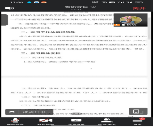 为扎实推进2023届学前教育专业毕业生教育实习工作,增强学生实习准备意识,让同学明确实习目的、任务和意义,并能以正确的态度迎接即将到来的实习。教育学院学前教育系于6月28日晚在腾讯会议上召开2019级学前教育专业教育实习动员大会。此次会议由学前教育系系主任杨瑛老师主持,学前教育专业实训室教研主任杨松慧老师、实习带队老师杨明胜老师和杨晓潜老师、2019级各班辅导员以及2019级全体学生参加本次教育实习动员大会。