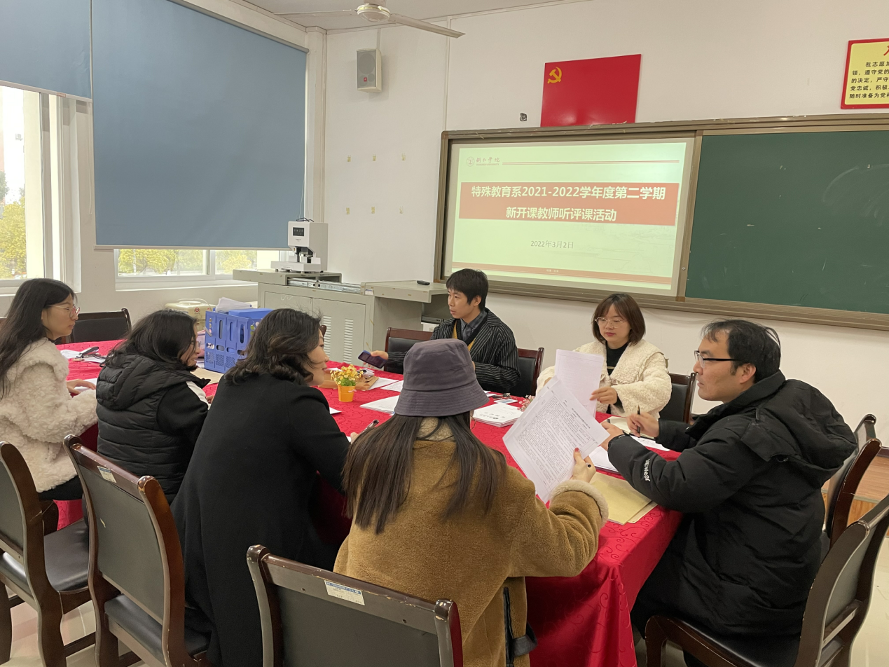为全面了解新开课教师的教学水平和专业素养,促使新开课教师加快角色转换,尽快适应教学岗位,不断提高教学能力,2022年3月2日下午,特殊教育专业在特殊教育系教师办公室开展了特殊教育新开课教师听评课活动,本次活动由特殊教育系负责人彭霓主持,参加本次活动的有陆艳、宋健、刘丹、刘方林、王诗尧等相关教师。