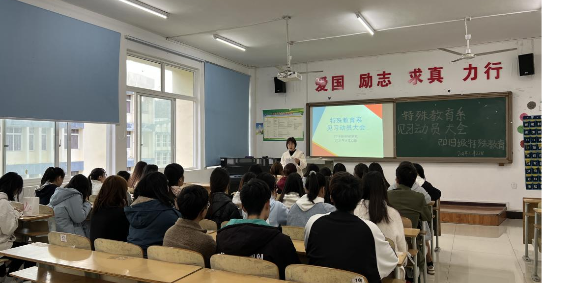 为了加强学生专业学习,培养学生实践能力,根据特殊教育专业人才培养方案及教育见习大纲要求,结合特殊教育专业本科课程安排以及专业发展需求,于11月22日晚在明理楼B306开展特殊教育系见习动员大会,参加本次活动的有特殊教育系系主任彭霓、专业教研室主任宋健博士、2019级特殊教育班全体学生。