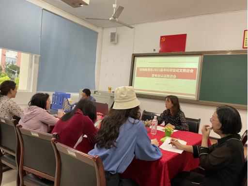 为我系学生顺利完成毕业论文答辩,提高专业人才培养质量,为更进一步专业认证工作,特殊教育系于5月12日下午召开了2021届本科毕业论文推进会暨专业认证推进会议。特殊教育系全体教师参加了本次会议,会议由特殊教育系负责人彭霓主持。