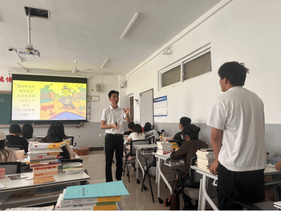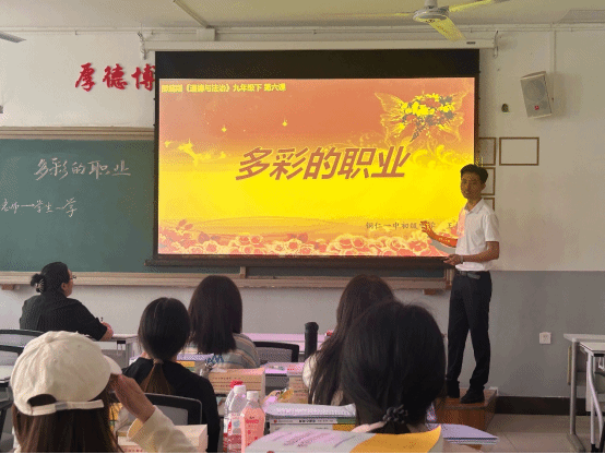 第二堂实践课中,王标老师以九年级第六课“多彩的职业”为载体,开展议题式教学示范。课堂以趣味谜语“学习十佳好少年(打一职业)”“靠运气生活的人(打一职业人)”开场,瞬间点燃学生兴趣,自然引入课程主题。围绕核心议题,他将学生分为小组,引导其结合个人兴趣、社会需求及国家发展战略展开讨论。通过引入各种鲜活案例,让学生在分析、辩论中深化对职业价值与社会责任的理解。展示环节,他巧妙融入课程标准要求,指导学生从职业认知、生涯规划等维度提出方案,将理论知识转化为实践能力。