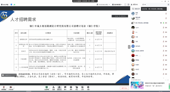 紧接着,分别由铜仁外国语学校、贵州倍易通科技有限公司、中国人民财产保险股份有限公司铜仁分公司和铜仁市城乡规划勘测设计院的招聘负责人就毕业生关心的“企业基本情况、招聘岗位要求、职业发展”等方面通过PPT讲解,播放企业宣传片的方式向同学们进行了详细介绍。会上,各企业招聘负责人对毕业生求职的注意事项予以了具体的指导,并通过线上详细解答了同学们提出的疑问,会议在热烈讨论中圆满结束。