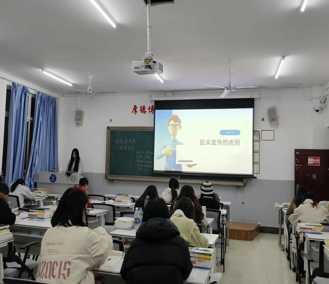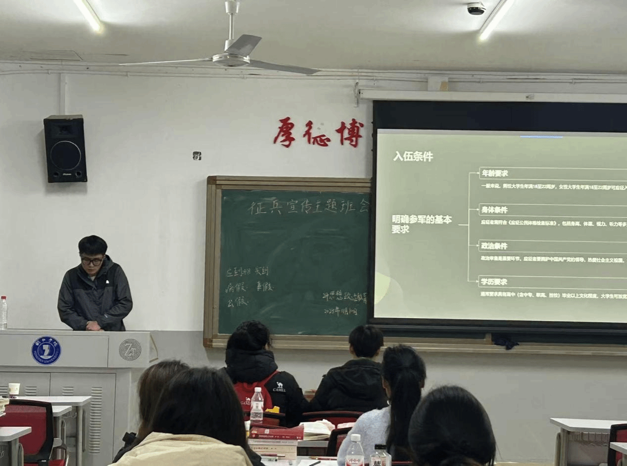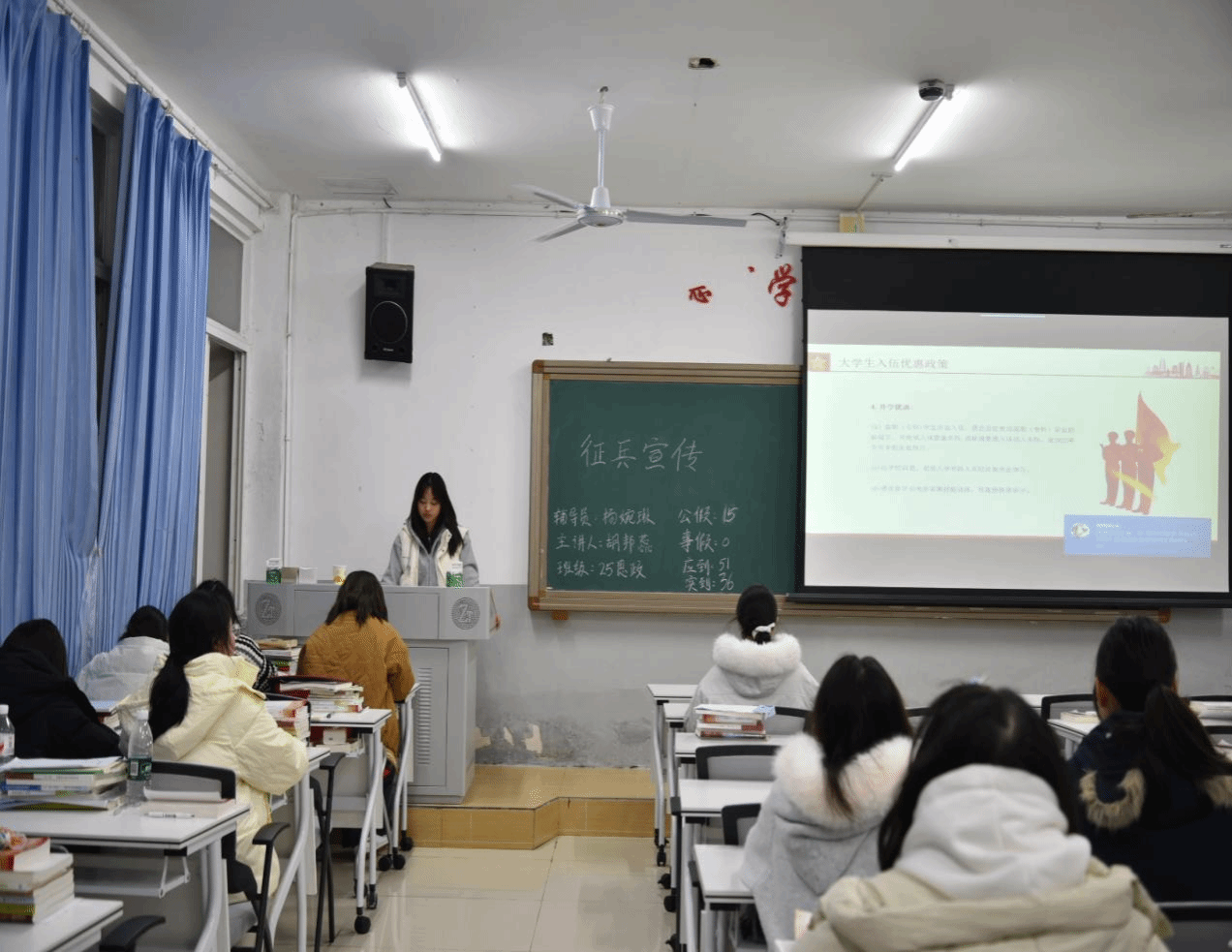 2025级、2024级以及2023级班会现场,各班主讲人围绕征兵工作要求,从政策解读、权益保障、成长价值等方面进行详细宣讲。在政策要点环节,重点讲解了本科应届毕业生、在校生一次性入伍资助奖励,以及其他资助政策;针对学业保障,详细讲解了退役复学后免修军事类课程、申请转专业学分冲抵学业激励政策,让同学们清晰知晓“入伍不影响学业,服役更助力成长”的保障体系。同时,对报名流程、应征条件等关键信息进行逐一强调,确保政策传达无遗漏。2022级学生则根据实际情况开展线上会议,由辅导员陈伟华老师进行征兵工作的讲解和答疑,将宣传工作做到全覆盖,并动员适龄青年积极应征报名