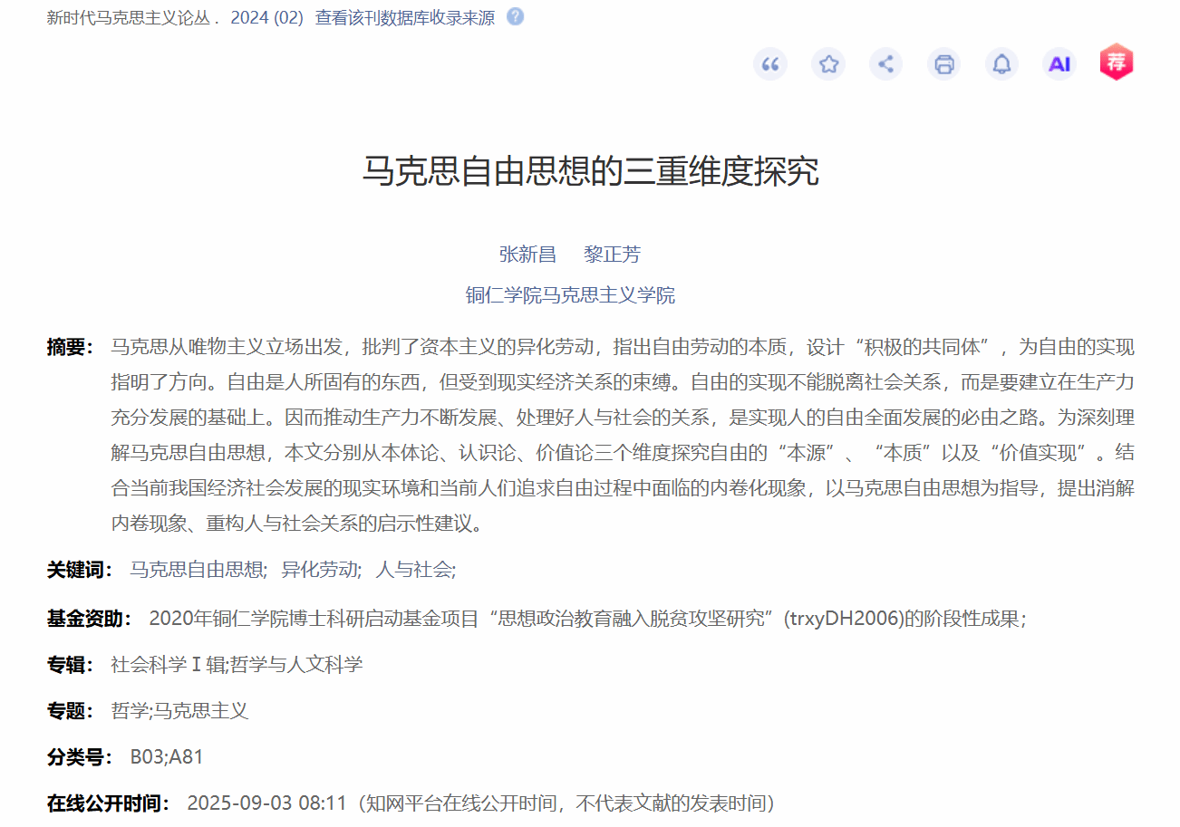 院副院长张新昌副教授与2023级硕士研究生黎正芳撰写的论文马克思自由思想的三重维度探究在《新时代马克思主义论丛》2024年第2期发表。该研究从本体论、认识论和价值论三个维度系统阐释了马克思自由思想的深刻内涵并结合经济社会发展的现实环境和人们追求自由过程中面临的内卷化现象,提出消解内卷现象、重构人与社会关系的实践路径