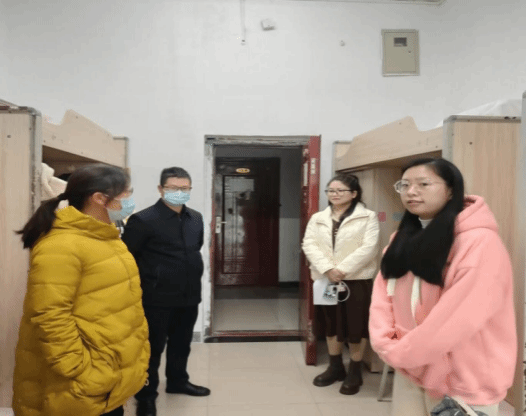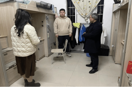 在寝室走访过程中,张江林书记向同学们宣讲了习近平新时代中国特色社会主义思想和党的二十大精神。他鼓励同学们要在思想上积极追求进步,向党组织靠拢。要在学习上刻苦努力,争取更大进步。同时,他还仔细查看了同学们的棉被是否保暖,寝室用电是否安全,叮嘱同学们注意网络诈骗、注意出行安全。党委副书记李兢,副院长赖全、张新昌认真查看宿舍用电安全、宿舍卫生、通风等相关事宜。阳娟老师提醒同学们要注意添衣保暖,预防感冒。