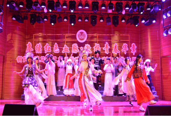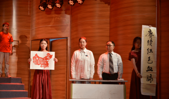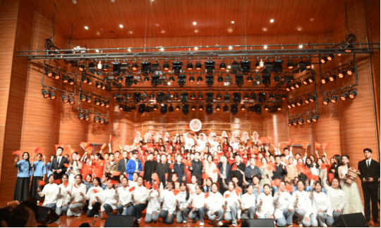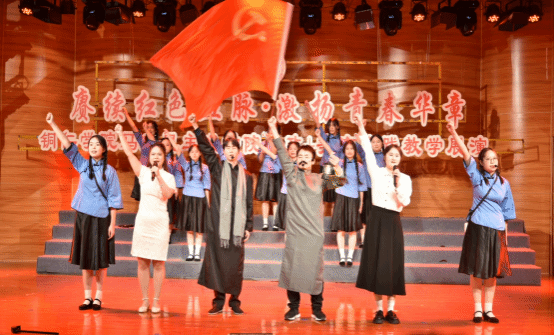 展演活动以“赓续红色血脉,激扬青春华章”为主题,通过歌曲、舞蹈、朗诵、情景剧等多种艺术形式,将思政教育与美育完美融合,生动展现了革命历史的壮丽画卷和新时代青年的青春风采。展演活动在光影交错的影子剧《中华崛起》中拉开序幕,同学们伴随激昂的配音,以饱满的情感,演绎着中国共产党诞生的伟大历程和一路走来的艰苦岁月。随后,一系列形式多样、内容丰富的节目轮番上演。如朗诵《红船》,以生动的表演重现了新文化运动时期青年学子们为国家命运奔走呼号、奋勇抗争的场景。如情景剧《困牛山的英雄赞歌》,深刻体悟到困牛山红军壮士们的 “绝对忠诚、信念坚定、勇于牺牲、赤诚为民” 的崇高精神;如舞蹈《美好新生活》表现了对中华民族共同体的意识,对中华民族一家亲的祝愿,同时表达了对中国的繁荣以及美好生活的向往。最后,全体师生齐唱《歌唱祖国》,唱出了每一个中华儿女内心深处对祖国母亲的眷恋、热爱和忠诚。