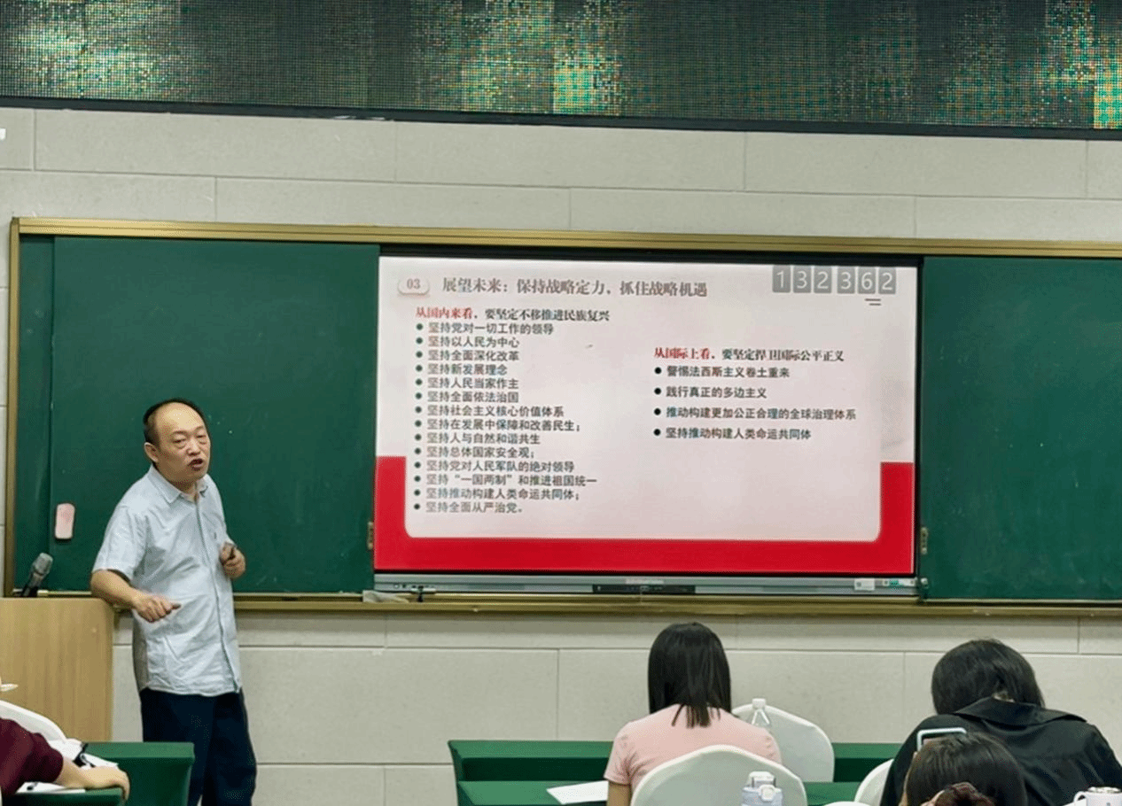 杨学礼老师从当前局势、回望历史、展望未来三个角度详细论述了抗日战争胜利在不同维度的伟大意义,当今世界正处于“百年未有之大变局”,国际格局深刻变化,中国面临诸多机遇与严峻挑战。他强调,铭记历史、缅怀先烈、珍爱和平、开创未来是纪念抗战胜利的重要意义,也是当下中国发展的必然要求。应当坚持和弘扬正确的二战史观,坚决反对美化侵略、歪曲历史的错误言行,维护战后国际秩序,推动构建人类命运共同体。同时,铭记历史不是为了延续仇恨,而是为了从历史中汲取力量,珍爱和平,开创未来。