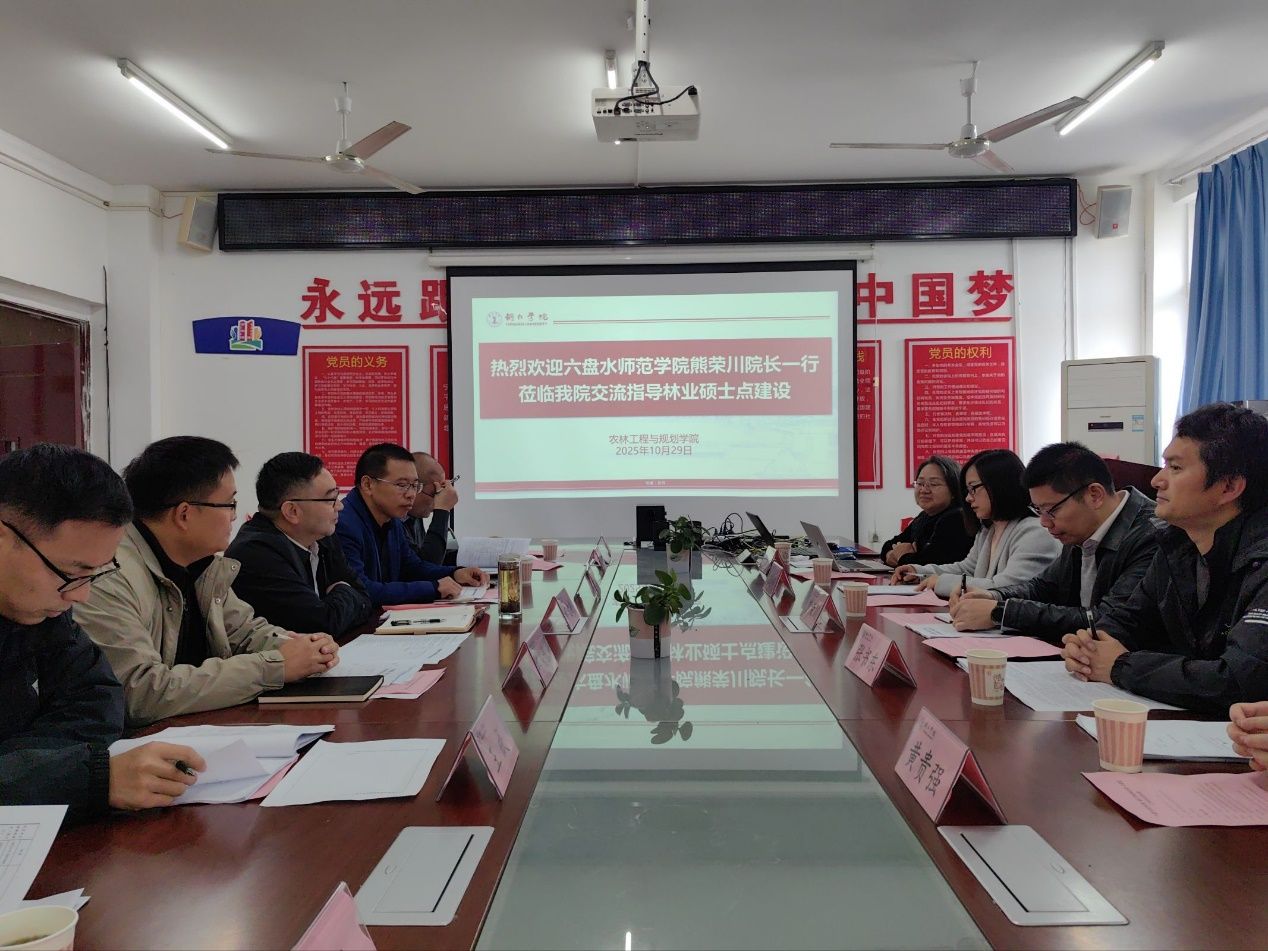 2025年10月29日上午,六盘水师范学院生物科学与技术学院院长熊荣川、副院长张书东、林学系副系主任纪婷婷、专任教师黄贵强教授和徐晓玲副教授一行5人来我院进行交流林业硕士点建设工作我院党委书记李建新、院长张俊波、林业硕士点执行负责人周红、林业骨干教师代表王锯钢、刘敏、王成科研与学科建设科科长邱发根莫忠妹老师参会,会议由张俊波主持。