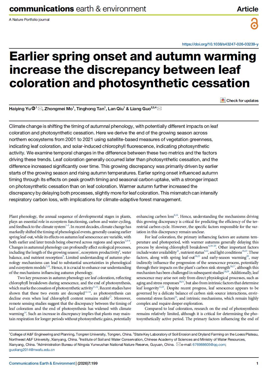 近日,我院于海英博士在《Communications Earth & Environment》发表了题为“Earlier spring onset and autumn warming increase the discrepancy between leaf coloration and photosynthetic cessation”的研究论文。我院系论文第一署名单位,于海英为第一及通讯作者,西北农林科技大学郭梁教授为共同通讯作者,学院教师莫忠妹、谭廷鸿和邱岚共同参与了本项研究。