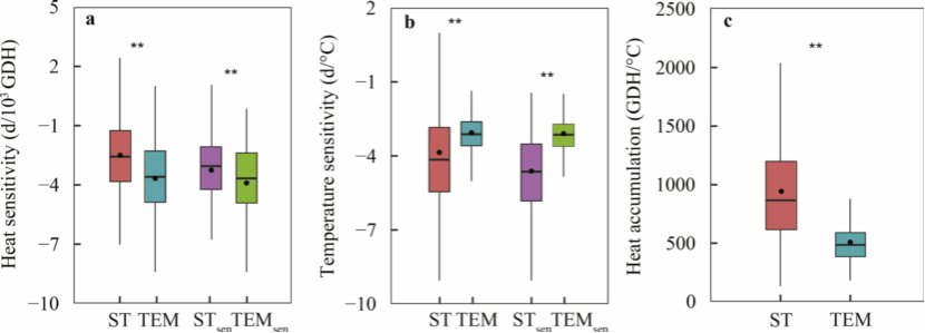 亚热带与温带木本植物展叶始期温度敏感度和热量累积的差异性对