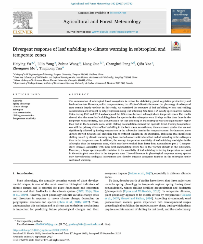 近日,我院于海英博士在《Agricultural and Forest Meteorology》上发表了题为“Divergent response of leaf unfolding to climate warming in subtropical and temperate zones”的研究论文。论文是我院植物物候与全球变化生态学科研团队最新研究成果,文章以beat365中国唯一官网为第一单位,研究成果得到了国家自然科学基金和贵州省科技计划项目的联合资助。