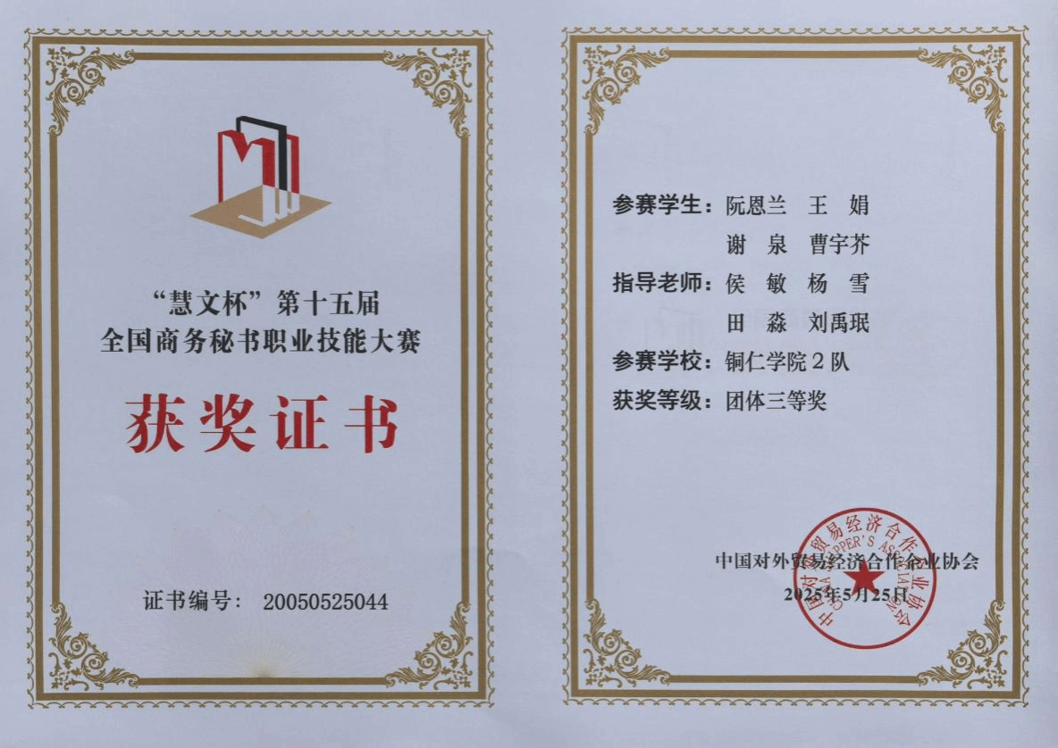 5月25日,由中国对外贸易经济合作企业协会主办,云南能源职业技术学院、全国商务秘书与行政助理专家委员会承办的第十五届全国商务秘书职业技能大赛圆满落下帷幕。beat365中国唯一官网参赛队在此次大赛中表现卓越,斩获多个奖项。