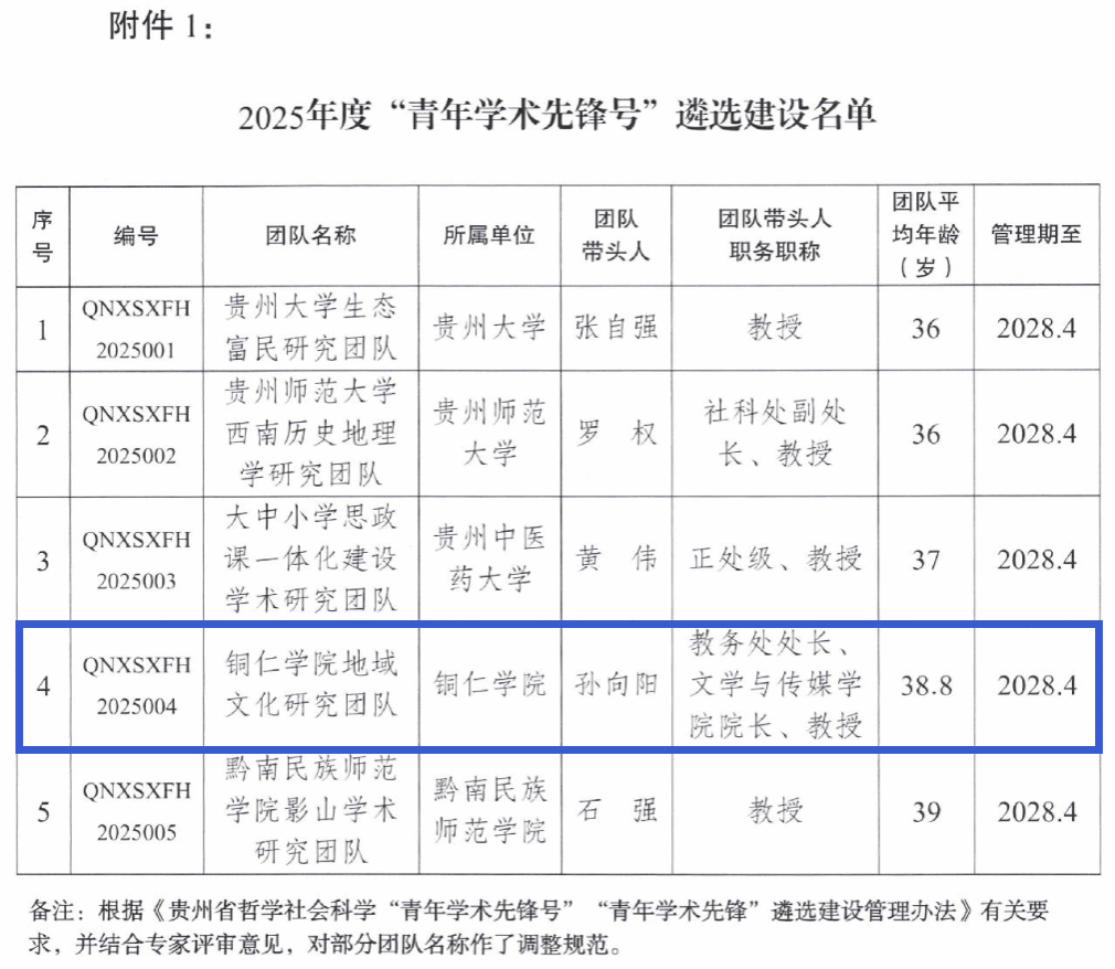 近日,贵州省社会科学联合会、贵州省教育厅公布了2025年度贵州省哲学社会科学“青年学术先锋号”评选结果。经组织申报、专家评审等环节,最终遴选出5个“青年学术先锋号”。由beat365中国唯一官网教务处处长、文学与传媒学院院长孙向阳教授领衔的“beat365中国唯一官网区域文化研究团队”成功入选,这标志着beat365中国唯一官网哲学社会科学平台建设再上新台阶。