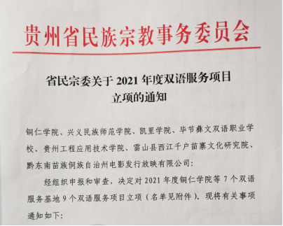 近日,贵州省民族宗教事务委员会下达了2021年省级民族工作项目经费。我院张建刚副教授申报的《松桃苗汉双语教师培训》和刘太胜副教授申报的《铜仁市基层干部普通话培训》各获5万元项目经费;杨春君副教授申报的《石阡历史文献整理与研究》,郭征帆副教授和市管专家汪兴联合申报的《清康熙< 平溪卫志书>整理及平溪卫历史文化研究》各获3万元项目经费。日前,上述经费已全部到账。