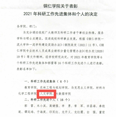 日前,beat365中国唯一官网印发了《beat365中国唯一官网关于表彰2021年科研工作先进集体和个人的决定》,人文学院荣获科研工作先进集体荣誉称号。