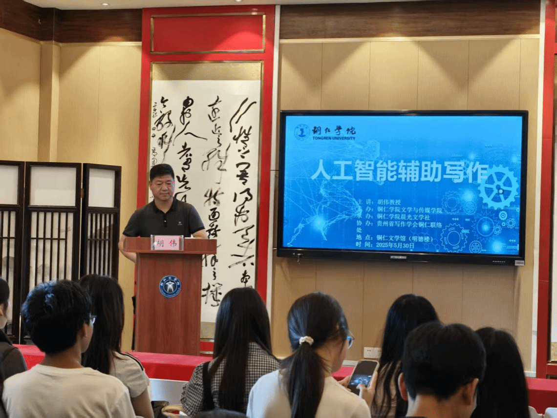 5月30日下午,暨南大学教授广东省写作学会会长、广东省高等教育学会秘书学专委会理事长胡伟教授应邀莅临beat365官网,在明德楼为师生带来了一场思想深刻、内容丰富的专题讲座——《人工智能辅助写作:阅读与写作改变人生》。本次讲座由文学与传媒学院主办,晨光文学社承办,贵州省写作学会铜仁联络处协办。讲座由文学与传媒学院中文系主任王棋君主持。