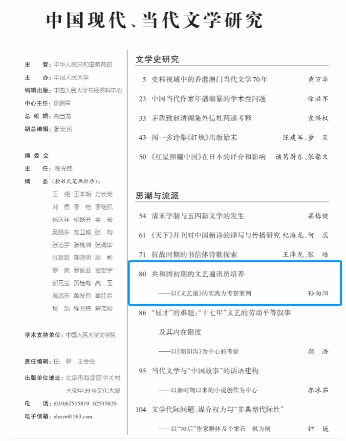 近日,我院孙向阳教授的学术论文《共和国初期的文艺通讯员培养——以〈文艺报〉的实践为考察案例》被人大报刊复印资料《中国现代、当代文学研究》2025年第5期全文转载。该文10000余字,原载《中国当代文学研究》2025年第1期。