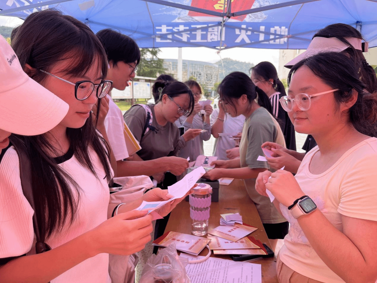 活动包括普通话法律法规、政策宣讲,趣味断句,句子诵读拼图,形似字辨音,趣味造句,发放宣传手册等多个环节,着重从辨字正音、趣味谐音梗、断句对语义的影响和“句子拼接+诵读”等方面设计活动内容,形式多样,融知识性、趣味性、互动性于一体,活动规则简单,答对问题即可参与抽奖获得奖品。活动现场人头攒动,师生情绪高涨,踊跃参与,推普氛围浓厚。