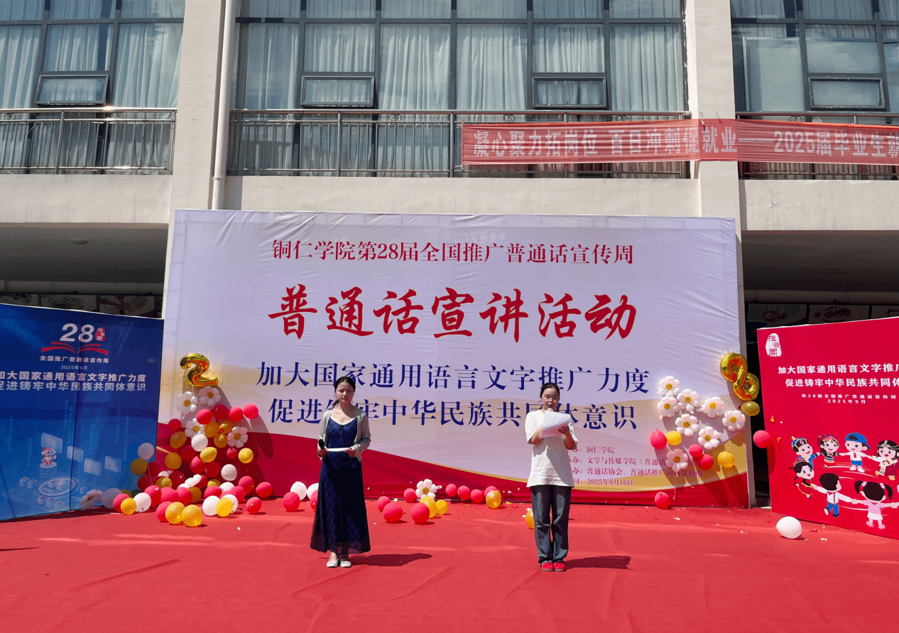 九月第三周为全国推广普通话宣传周(以下简称推普周),为教育强国贡献语言之力,进一步巩固强国语言基石,提升国民语言能力,特别是青年大学生的普通话水平,9月16日,我院普通话水平测试站结合“加大国家通用语言文字推广力度,促进铸牢中华民族共同体意识”的推普主题,开展了第28届全国推广普通话宣传周普通话宣讲活动。文学与传媒学院党委副书记杨雪、副院长张建刚出席活动,王棋君、何赟、张丽娅等相关专业、科室负责人和王梅、刘全莉、肖跃玲等部分普通话测试员教师及普通话协会、推普项目课程组学生参加活动,学校语委办常务副主任、普通话水平测试站负责人刘太胜老师担任现场指导,汉语言文学专业学生张樱子、万洁担任现场主持人。