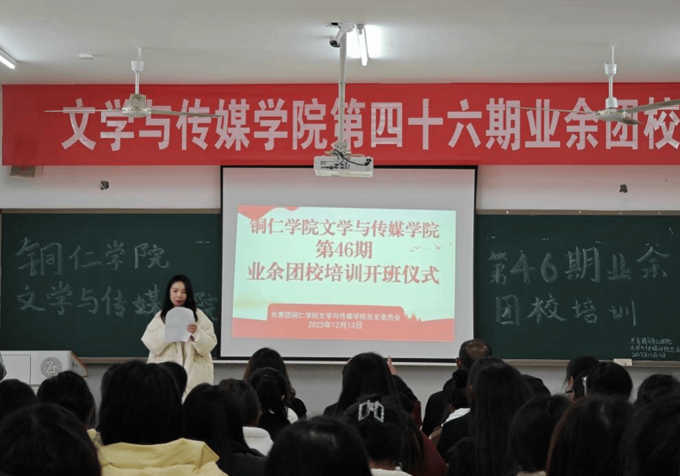 为深入学习领会习近平新时代中国特色社会主义思想和党的二十大精神,加强团员队伍建设,全面提升学生干部的理论水平及工作能力,12月13日,我院在依仁楼A402举行第46期业余团校培训班开班仪式。文学与传媒学院党委书记、院长孙向阳,党委副书记杨雪,副院长张建刚,学生科负责人杨蓉出席仪式,第四十六期业余团校培训班学员参加,团总支负责人杨梦阳主持仪式。