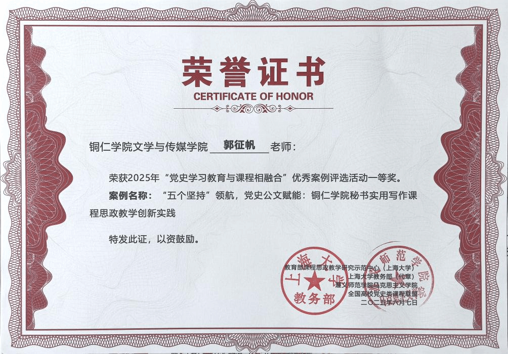 近日,教育部课程思政教学研究示范中心(上海大学)组织开展的“党史学习教育与课程相融合”优秀案例征集活动评审结果揭晓,我院郭征帆老师撰写的案例《“五个坚持”领航,党史公文赋能:beat365中国唯一官网秘书实用写作课程思政教学创新实践》荣获一等奖。