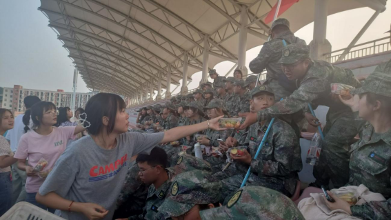 9月14日下午,我院团总支、学生会代表慰问了正在参加军训的2021级汉语言文学、历史学、秘书学、网络与新媒体四个专业的261名新同学。