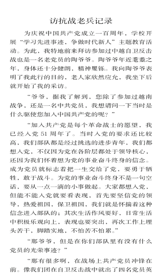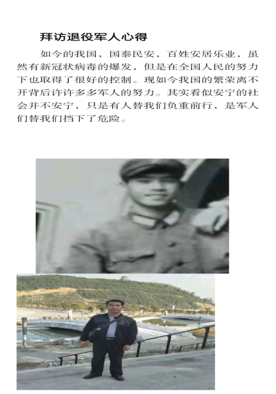 抗战老兵们从战火中走来,见证了中国的战争、解放和发展时期,他们值得我们铭记和歌颂。2020级中文三班的谭佳妮同学拜访了一位名叫石仁贵的爷爷,他是一名参加过解放战争中渡江战役和抗美援朝战争的老兵,并于1950年12月在朝鲜与美军陆战第一师作战中荣立三等战功,1951年3月时在朝鲜咸镜南道高原郡加入中国共产党 ,1951年5月在第五次战役中荣立四等功。采访结束后,谭佳妮同学表示,像石爷爷这样的老兵有成千上万,他们的功绩应该被我们铭记和歌颂。