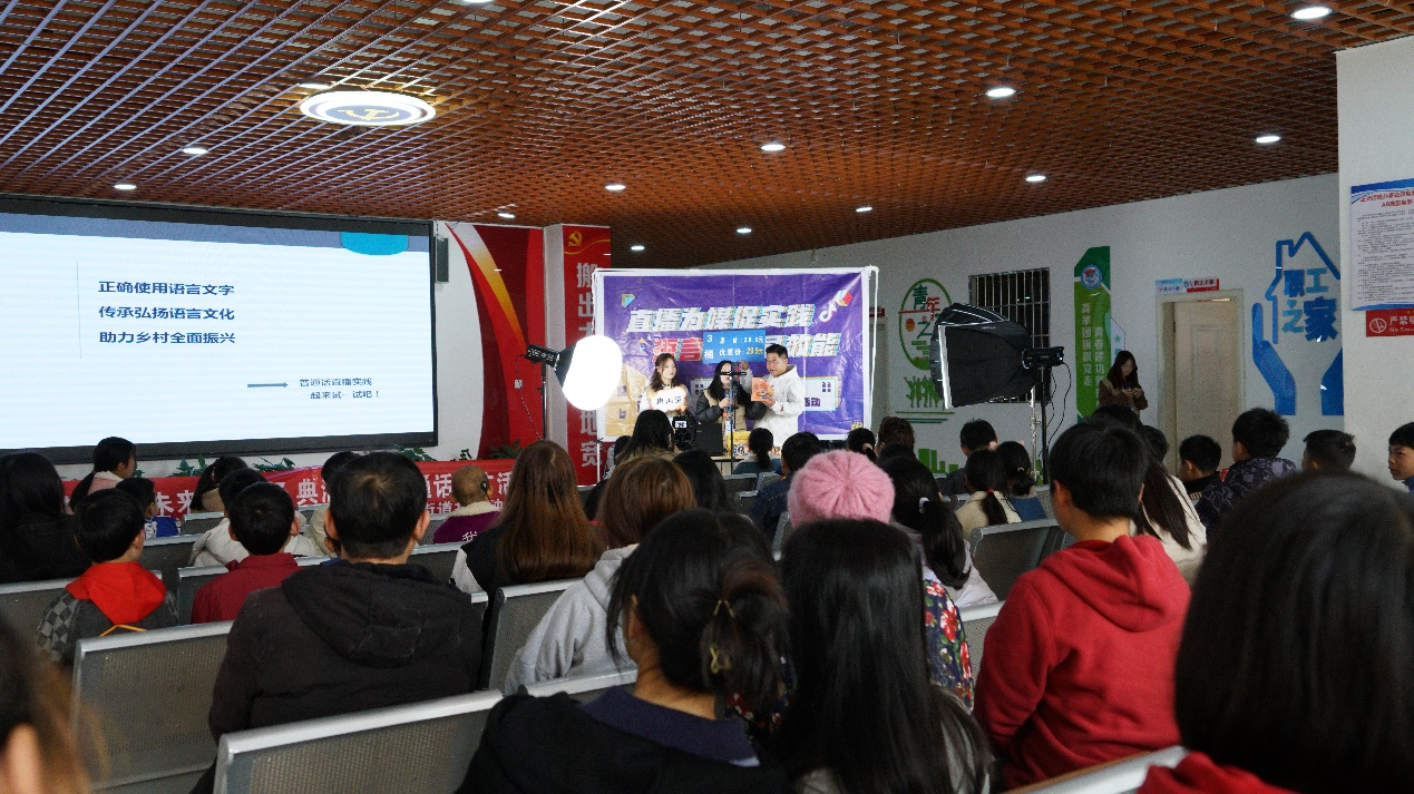 活动期间,刘太胜和张潇叶作了国家通用语言文字应用专项培训,为当地居民讲解了普通话基础知识、发音技巧等。杨梦阳和志愿者搭建了项目实践直播间,模拟线上招商、产销、旅游推广、本土文化宣传等情境,为参加活动的群众提供了语言表达实践平台,张潇叶对参与直播语言表达实践体验的人员作了点评和指导。期间,师生团队还发放了宣传手册、宣传画册等推普资料1000余份。