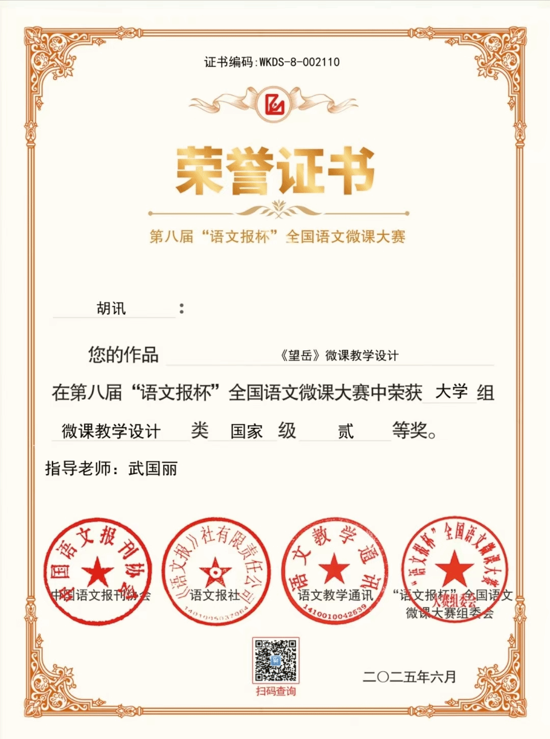 在第八届“语文报杯”全国语文微课大赛中,22级汉语言文学一班胡迅同学凭借《望岳》微课教学设计脱颖而出,荣获大学组微课教学设计类国家级二等奖。该赛事作为全国语文教育领域的权威平台,吸引了全国高校学子同台竞技。胡迅同学的作品以“诗画融合”为设计理念,通过情境化诵读、意象分析与跨时代联结,生动诠释了杜甫诗作的精神内涵,其创新的教学思路与扎实的文本解读能力获评委高度认可,为学院在国家级赛事中再添荣誉。