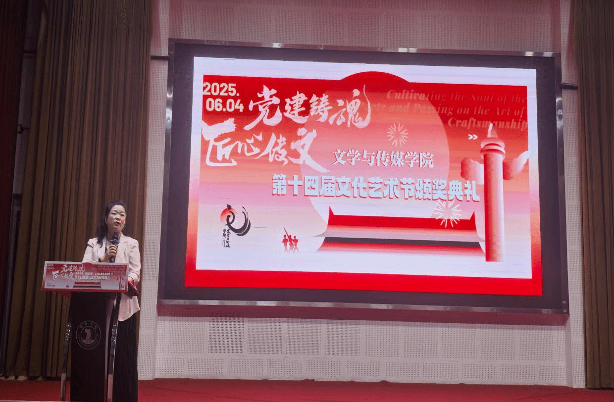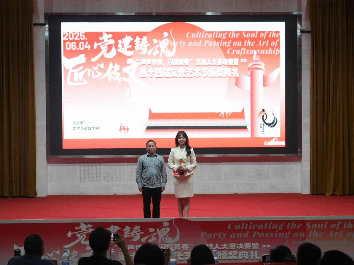 自第十四届文化艺术节开展以来,全院842名学生踊跃参与,累计达300余人次,71名同学在各项赛事中获奖。颁奖环节,梁正海副书记等与会领导依次为“我与文传院的故事”征集活动、“声刻红旗·音承匠心魂”红色主题配音大赛、“红色传承,匠心筑梦”红色主题手工创意制作比赛、“用AI绘画还原古诗词里的传统节日”作品征集以及主持人大赛五项活动的获奖者颁奖。