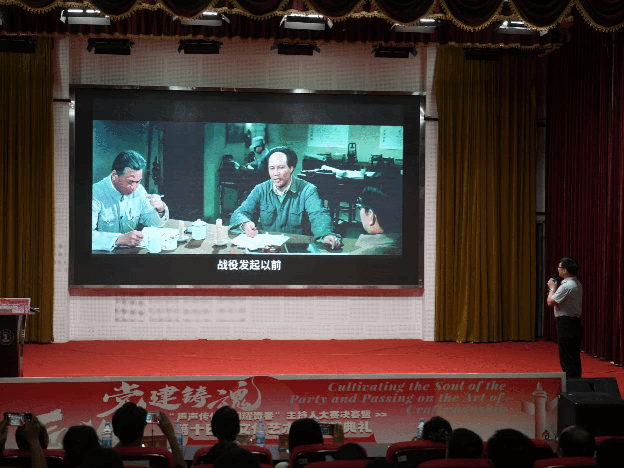 主持人比赛结束后,在文化艺术节配音比赛中表现出色的冯正红同学以电影《我的1919》片段进行配音演绎,郭征帆老师应邀点评,并以《大决战·淮海战役》片段作了示范,其精彩的演绎赢得了全场热烈掌声。