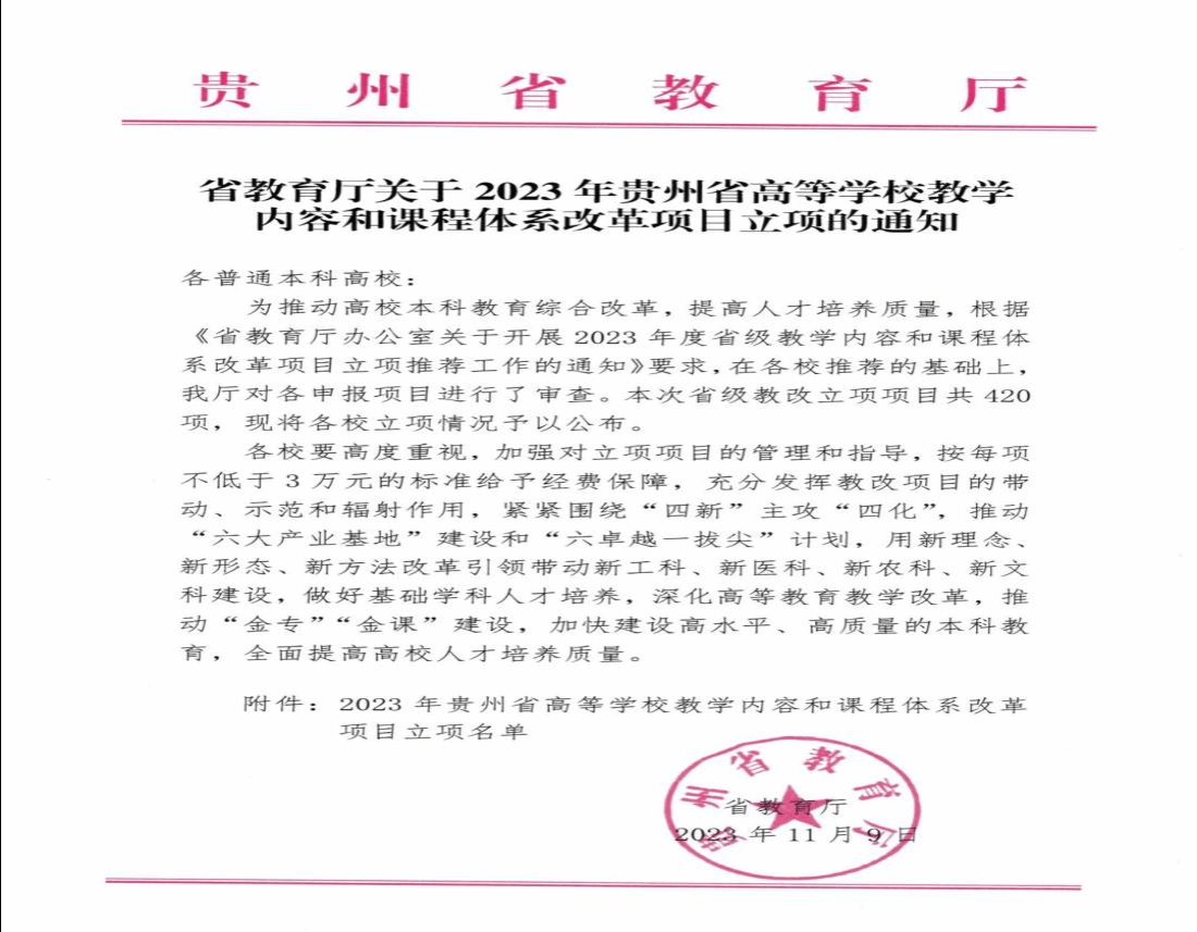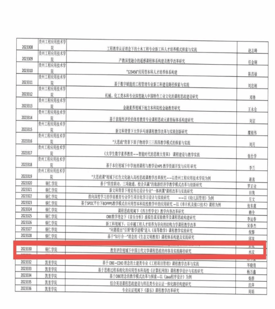 11月9日,贵州省教育厅公布了《省教育厅关于2023年贵州省高等学校教学内容和课程体系改革项目立项的通知》,文学与传媒学院水汶教授主持的项目《教育评价视域下中国古代文学课程思政的内容及实践路径研究》获批立项。