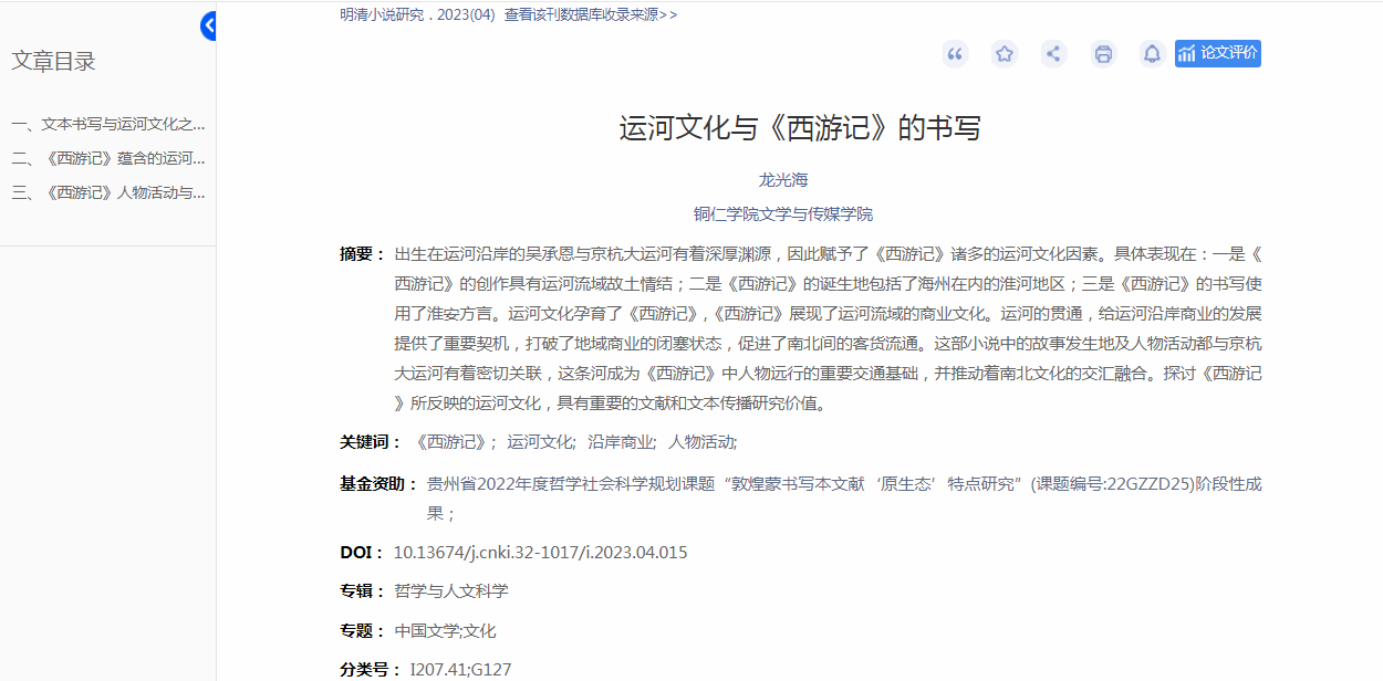 日前,我院龙光海博士的论文《运河文化与<西游记>的书写》,发表在人文社会科学学术理论重要期刊《明清小说研究》2023年第4期。