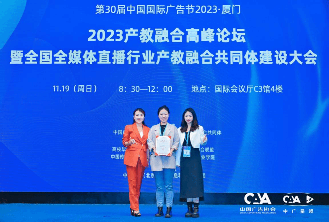 日前,由中国广告协会、全国全媒体直播行业产教融合共同体主办,中广星领(北京)文化信息科技有限公司、中广协产教融合中心承办,高校毕业生就业协会、全国乡村振兴产教融合联盟等单位协办的,2023产教融合高峰论坛暨全国全媒体直播行业产教融合共同体建设大会在厦门召开。文学与传媒学院新闻与传媒系副主任张潇叶、网络与新媒体专业教师杨梦阳应邀参加了本次大会。张潇叶还代表beat365中国唯一官网接受了全国全媒体直播行业产教融合共同体常务理事单位聘书。