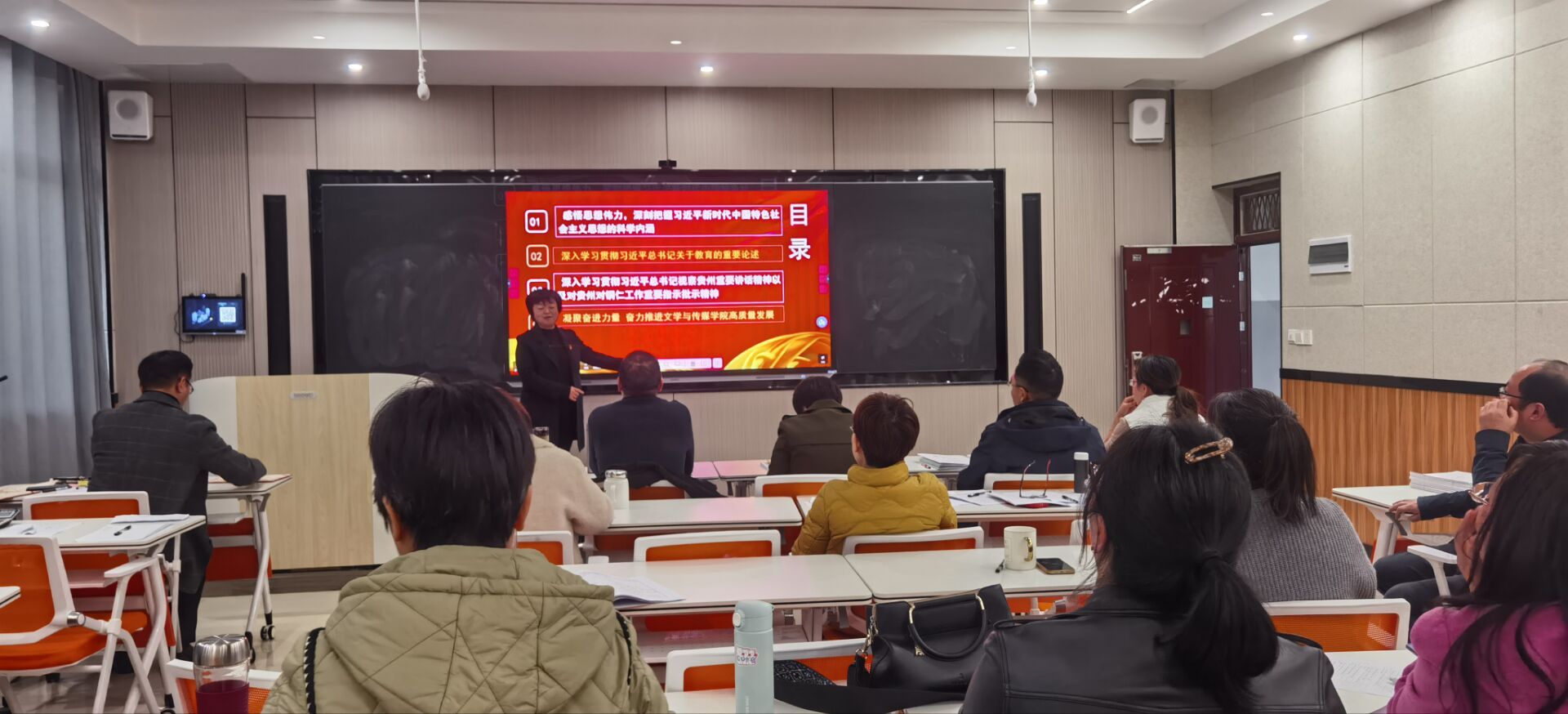 蒋小红以“感悟思想伟力,凝聚奋进力量”为题,围绕“感悟思想伟力,深刻把握习近平新时代中国特色社会主义思想的科学内涵” “深入学习贯彻习近平总书记关于教育的重要论述”“深入学习贯彻习近平总书记视察贵州重要讲话精神以及对贵州对铜仁工作重要指示批示精神”“凝聚奋进力量,奋力推进文学与传媒学院高质量发展”四个方面进行阐述。