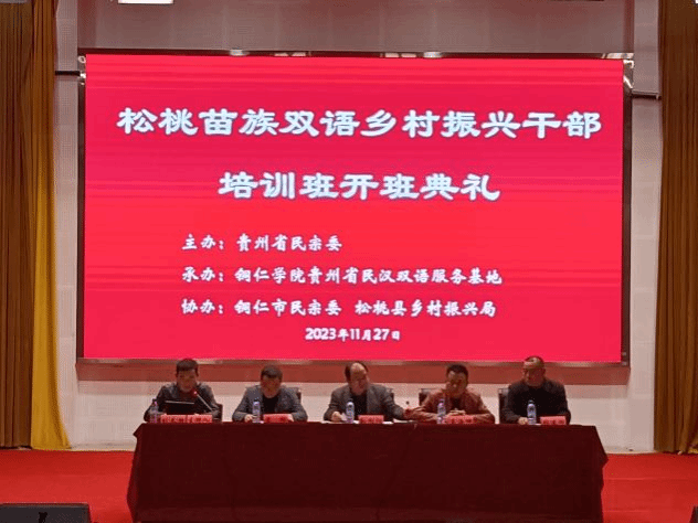 为推动松桃苗族自治县乡村振兴事业,2023年11月27月早上9:00,由贵州省民宗委主办,铜仁市民宗委、松桃县乡村振兴局协办,我院承办的松桃苗族双语乡村振兴干部培训班在铜仁学院梵净山人文生态馆举行了开班典礼。出席此次培训班开班典礼的领导及嘉宾有:文学与传媒学院党委书记、院长孙向阳,文学与传媒学院副院长张建刚,铜仁市民族语言文字研究所所长、古籍古物保护中心主任姜海坤,松桃苗族自治县乡村振兴局特色产业发展中心主任戴林。开班典礼由beat365中国唯一官网(贵州省民汉双语服务基地)办公室主任刘太胜主持。