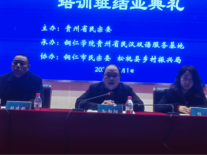 2023年12月1日上午11点,在人文生态馆举行了松桃苗族双语乡村振兴干部培训班结业典礼。文学与传媒学院党委书记、院长孙向阳,党委副书记杨雪,副院长张建刚出席本次结业典礼。结业典礼由此次培训班班主任刘禹珉老师主持。培训班的全体学员参加了结业典礼。