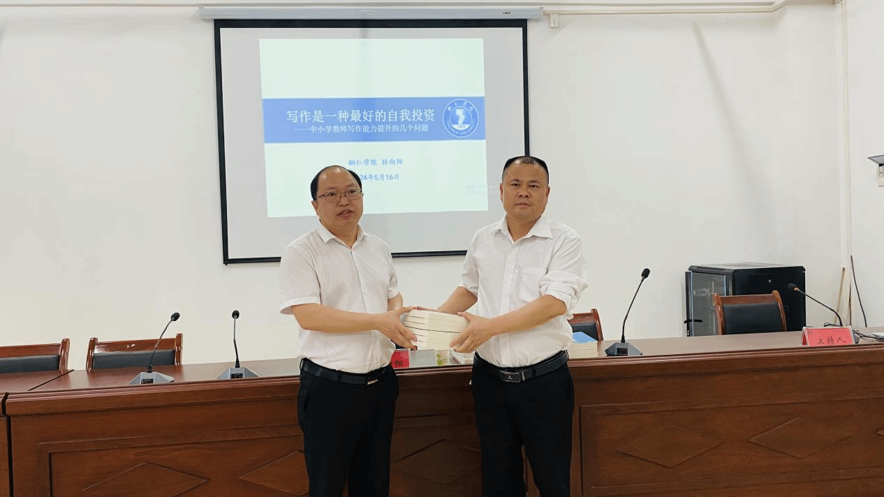 当天下午,龙江中学全体教师齐聚会议室。孙向阳首先向龙江中学赠送了刚出版的《基于学习任务群的初中语文整本书阅读教学设计》《基于学习任务群的高中语文整本书阅读教学设计》《铜仁语文教学名师课堂实录》(三卷本)等著作。接着,开展了主题为《写作是一种最好的自我投资——中小学教师写作能力提升的几个问题》专题讲座。 讲座中,孙向阳从“何为写作、为何写作、如何写作”三个方面为老师们做了分享,希望老师们能将生活和工作中的点滴记录下来,转化成文字,形成教研成果。在写作中提升格局、陶冶情操、增强素养,为更好培养时代新人打下坚实基础。