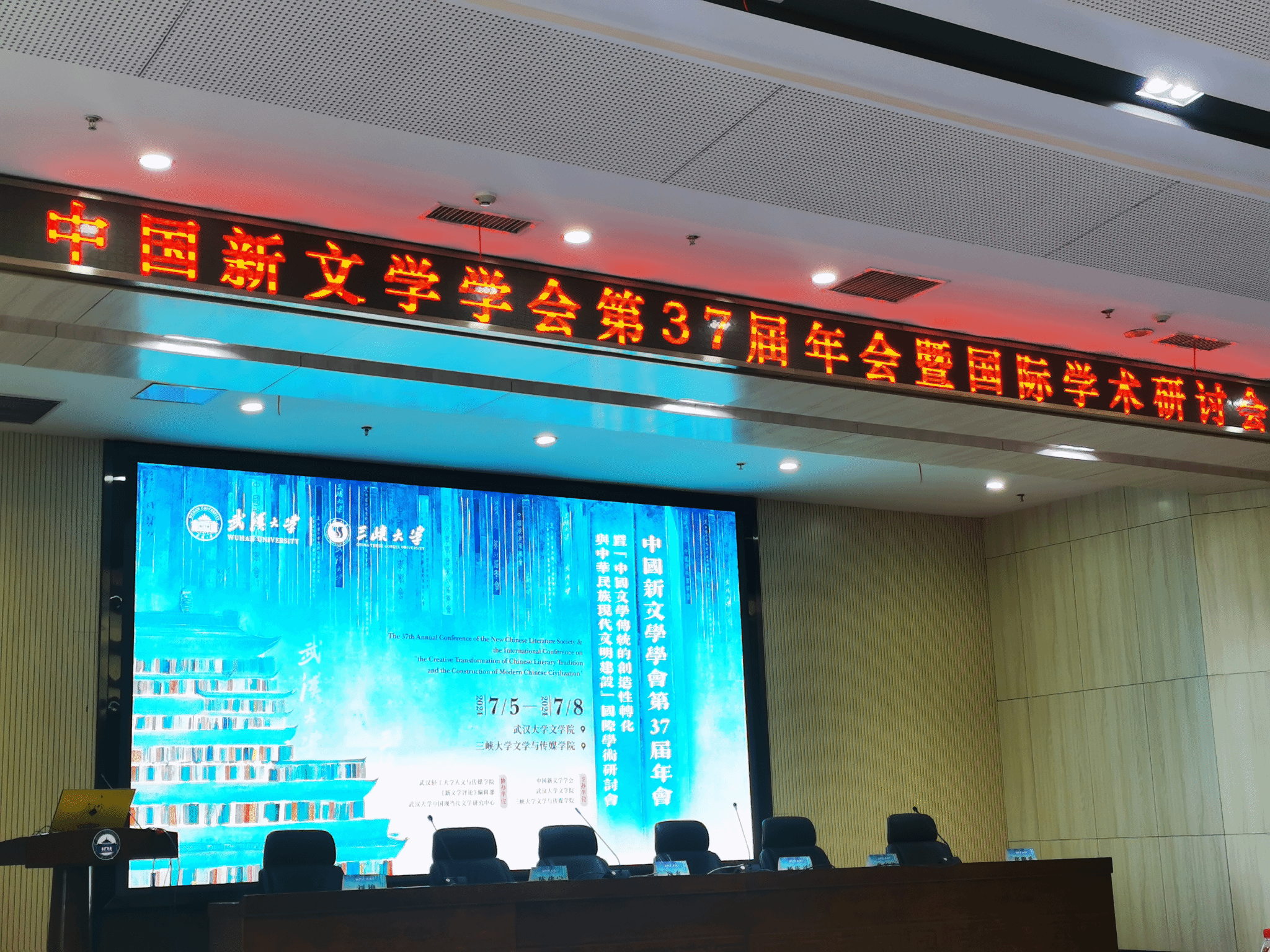 7月5日至8日,中国新文学学会第37届年会暨“中国文学传统的创造性转化与中华民族现代文明建设”国际学术研讨会在武汉大学和三峡大学召开。来自美国耶鲁大学、澳大利亚新南威尔士大学、法国巴黎西岱大学、德国法兰克福大学、日本东京大学、韩国中央大学、中国社会科学院、香港中文大学、澳门大学、北京大学、南京大学、中国人民大学、复旦大学、上海交通大学、北京师范大学等海内外160余所高等院校的300余位专家学者,围绕“中国文学传统的创造性转化与中华民族现代文明建设”主题深入研讨,共同探寻推进中国文学传统的创造性转化及中华民族现代文明建设的新方法与新路径,并向世界展示中国文学的理论深度与思想力量。我院孙向阳教授受邀参加此次盛会,主持第一小组研讨汇报并作主题交流发言。
